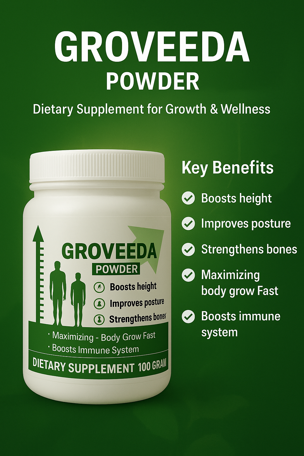 Maximize your body’s potential naturally with GROVEEDA Powder – a specially formulated herbal supplement designed to support growth, posture, bone strength, and immune health. Made from time-tested ingredients, this powder is ideal for individuals looking to enhance their physical development and well-being.